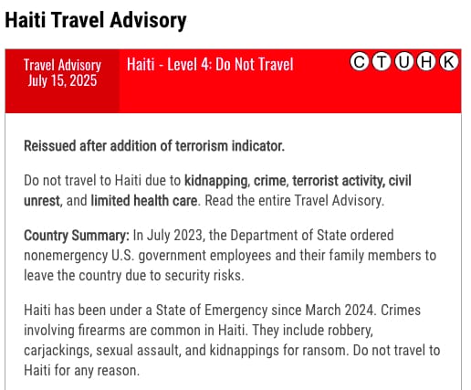 Haiti is, simply put, too dangerous for Americans to travel to under any circumstances. Gangs control 90% of the capital city of Port au Prince and the State Department warns Americans to avoid Haiti at all costs due to "kidnapping, crime, terrorist activity, civil unrest and limited health care," as well as "robbery, carjackings, sexual assault, and kidnappings for ransom. Do not travel to Haiti for any reason."