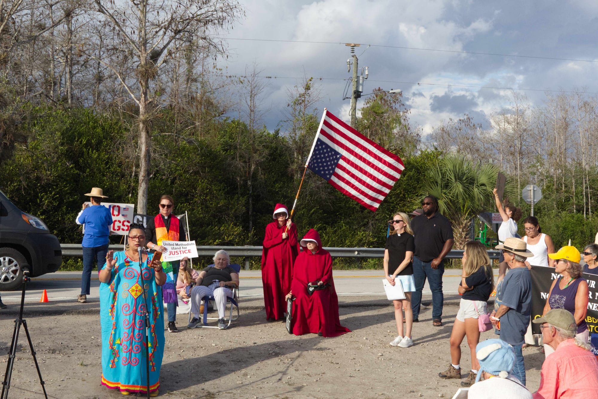 Pointing at the gates of the so-called Alligator Alcatraz she told the audience, "We definitely do not agree with what is happening with this criminalization of migration, and with this terror against people that," she paused and waved her hands in exasperation, "look different. Apparently look like terrorist. Apparently look like we are going to keep everything from this country.