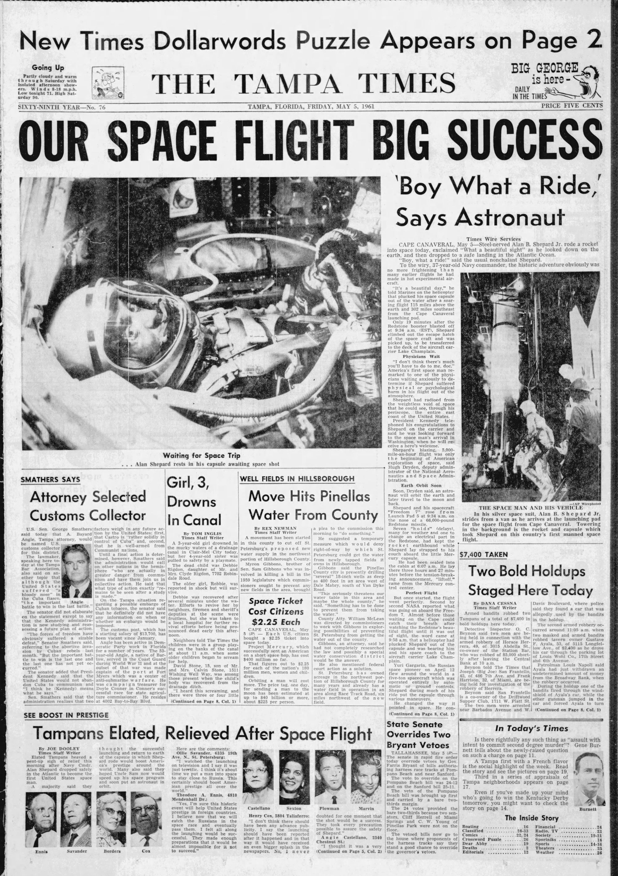 “Boy what a ride,” says Astronaut, in The Tampa Times headline that both understated the event and perhaps missed the historical significance that the name Alan Shepard would have for space flight nerds the world over.[1]On May 5, 1961, Alan Shepard rode a converted missile launched from Cape Canaveral, Florida, into space, becoming the first American and only the second human, to ever leave the Earth’s atmosphere. “What a beautiful sight,” he said from above the Earth. It would be almost a year later when John Glenn would surpass Shepard's flight into space by orbiting the Earth in February of 1962.