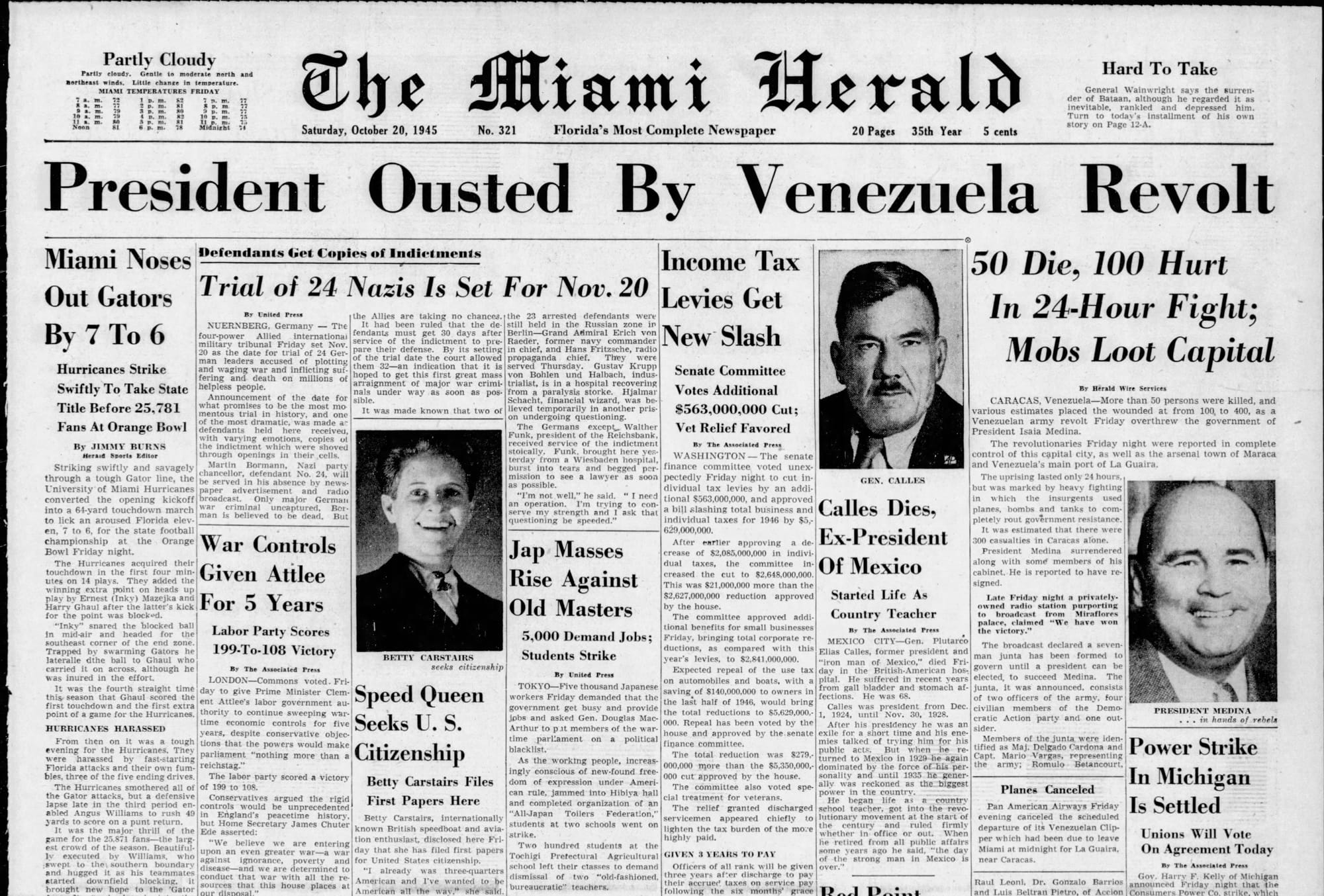 The Miami Herald ran a front page story about a successful coup d'état in Venezuela on October 18, 1945, alongside a story about Nazis being tried for what we now call war crimes (based on the Fourth Geneva Convention held in 1949). The trials of the Nazis in Nuremberg (the paper appears to have misspelled it or used a no longer used spelling) would of course become known as the Nuremberg Trials (this site is in German– you'll need to use your browser translator).