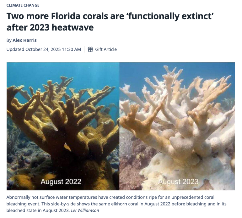 Also, two more species of coral– a species that is pretty to look at, but crucially, provides protections from things like tsunamis and hurricane storm surges, are extinct in Florida.