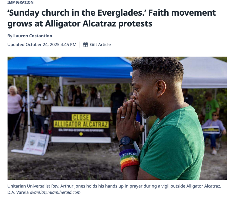 While Alligator Alcatraz persists, so do the prayer vigils advocating for the detainees, the detention officers, the land and the people of the land (the Miccosukee). The outstanding duo of Miami Herald reporter Lauren Costantino and photographer D.A. Varela did a wonderful job discussing this very thing this week. It is long. It is excellent. It is well worth your time. The link is to a free copy/gift article.