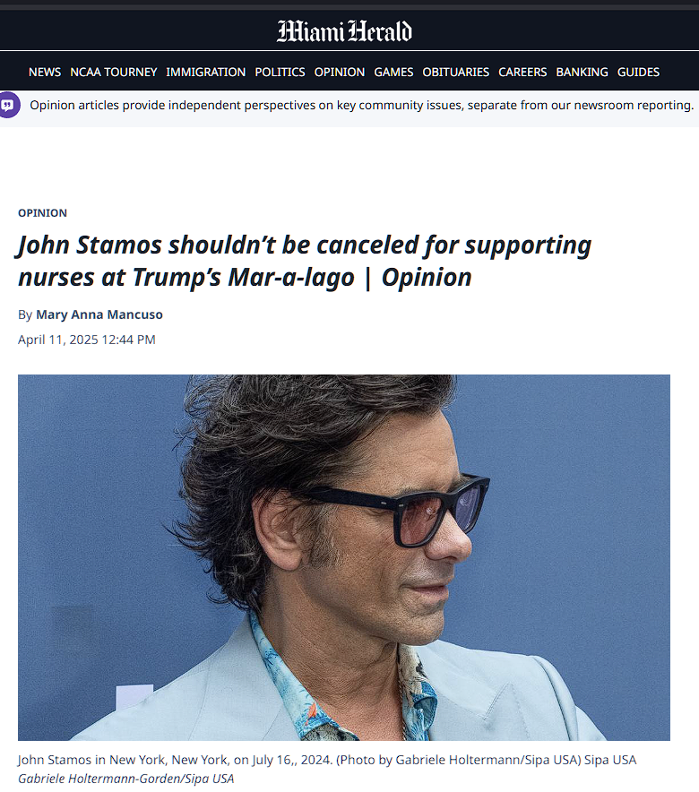 So, about John Stamos being canceled. I agree that criticism of Stamos for supporting nurses, even at an event at Mar-a-lago, is hardly warranted. However, I certainly understand why people might voice their opposition to it. But the framing this as another instance of "cancel culture is out of control" seems like telling me unicorns and space lasers are destroying the planet. I mean, I guess it's an opinion one might have, but is it worth shedding big tears in a major newspaper network over?