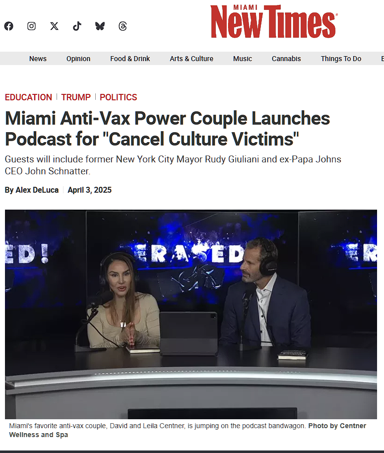 As we begin, let's look at the Miami New Times, another paper in Miami, talking about a new podcast, created by anti-vaxxers and funded by the windfall one of the anti-vaxxers got when he sold off SunPass. That's right Florida, one of the biggest tax collecting agencies in Florida was created by a private company and made a guy so rich he could champion measles and "canceled" celebrities like Rudy Giuliani and Papa John's founder John Schnatter. The program is called "Erased," taking the notion of being canceled even further to suggesting these "victims" have been erased.
