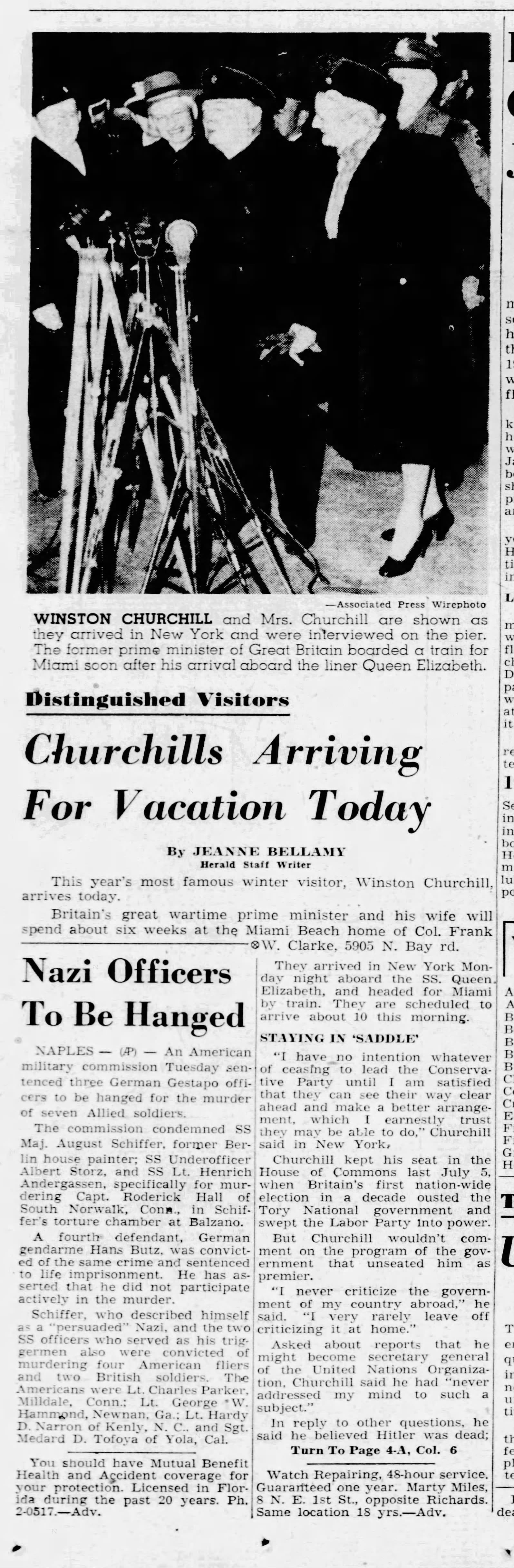 Whether or not the editor of the Miami Herald recognized the irony of announcing the long winter visit of "Britains great wartime Prime Minister" for six weeks in Miami Beach with an inset story about Nazi officers being hung I do not know. I do know that it is something worth noting. Also worth noting is that the Nazis in question were sentenced for execution for "the murder of seven allied soldiers." Though the famous Nuremberg Trials began in late November of 1945, the trials would not conclude until October of 1946. What is more, the Nuremberg Trials sought justice for unlawful invasions carried out by the Nazis and atrocities committed against civilians, seeking defendants that represented different agencies within the Nazi regime. That led to the trials of just 24 people and the eventually sentence to death for 11. Of those, ten were hung while Hermann Wilhelm Göring committed suicide the night before his date with the gallows.