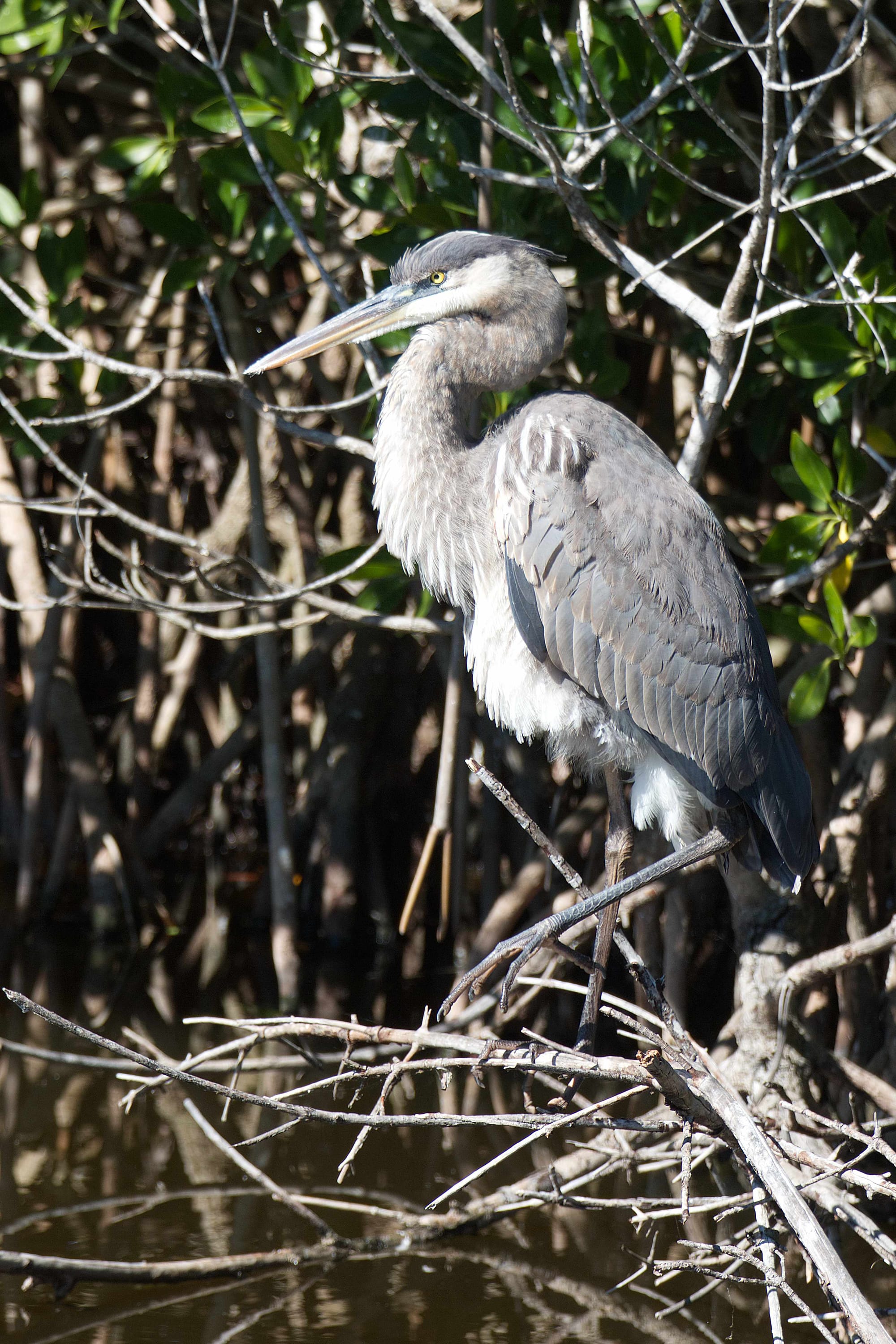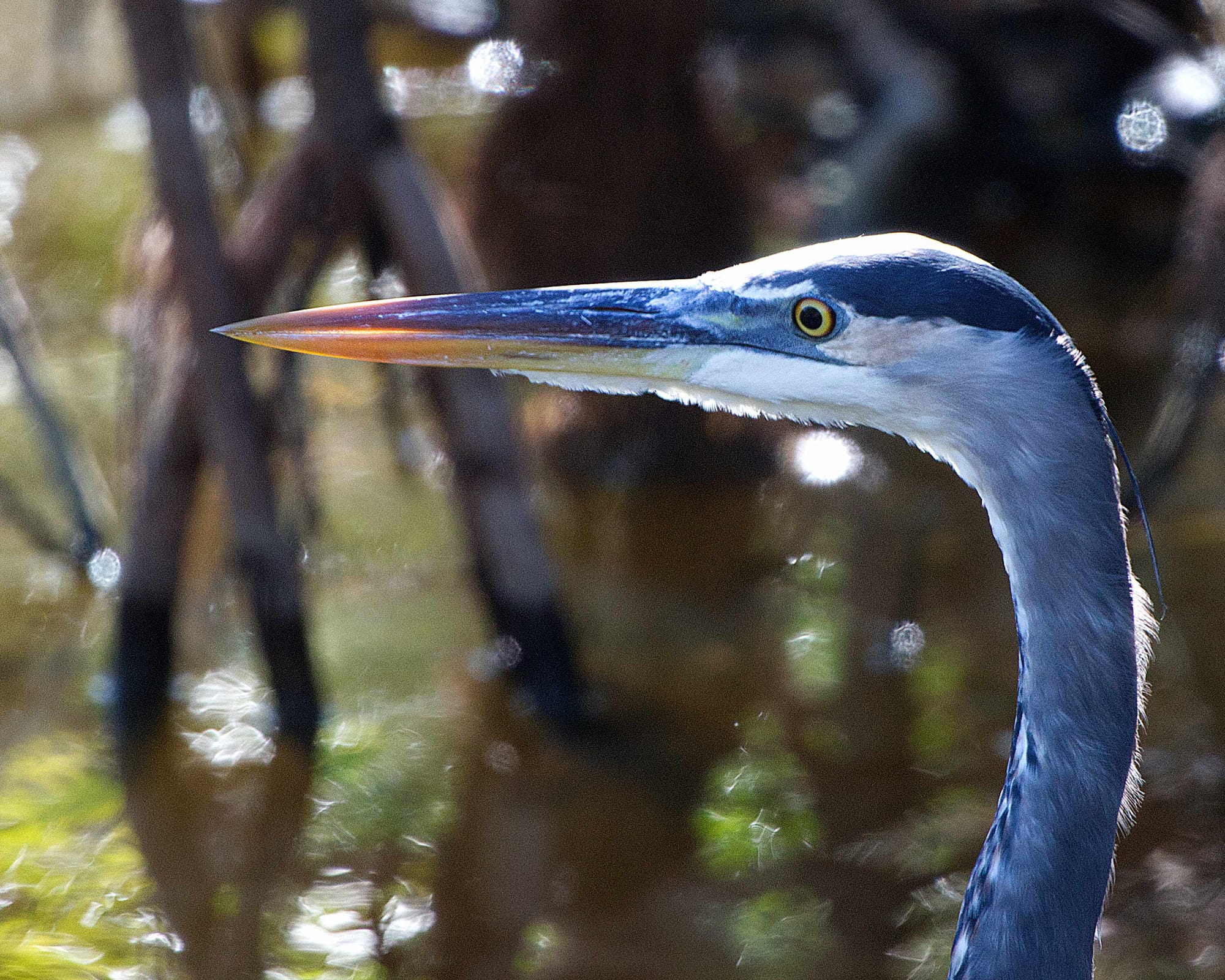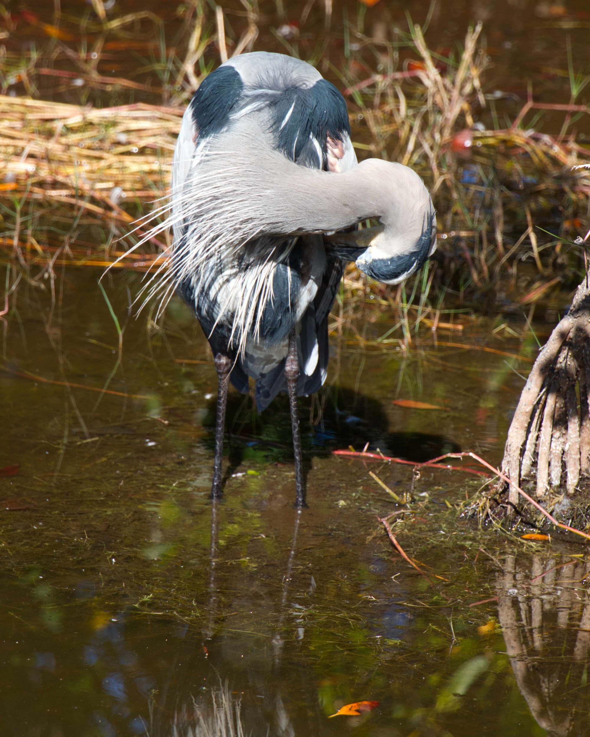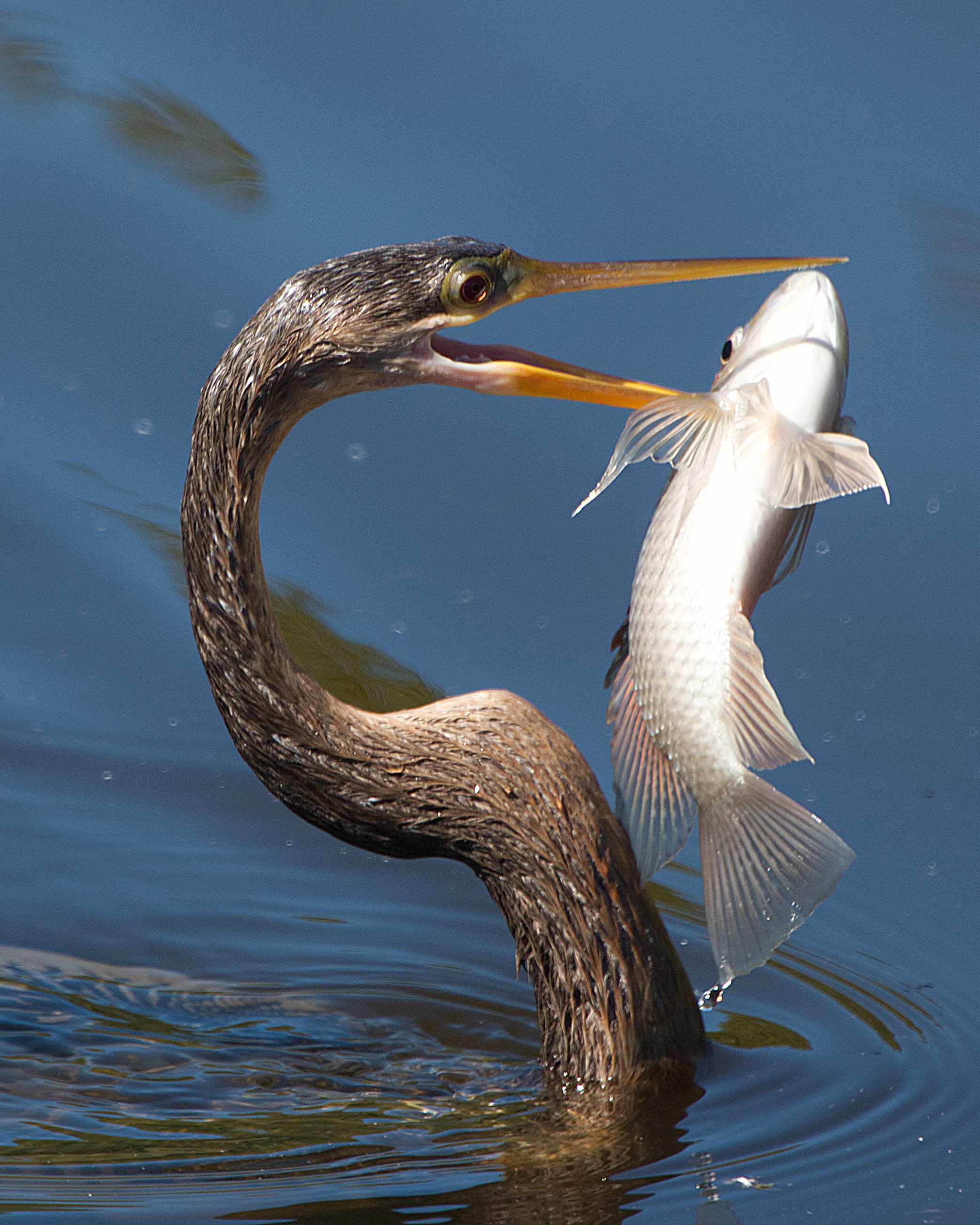 A blue heron looking for food, a blue heron cleaning its feathers, a scary heron of some sort looking scary, three alligators getting a tan and a female anhinga spears a fish. All photos by Philip Cardella.
