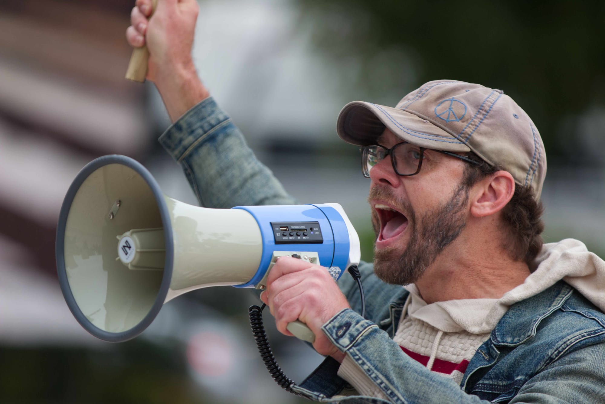 The two men with megaphones are climate scientists who were recently laid off. About 30 people joined the protest to protect climate science.