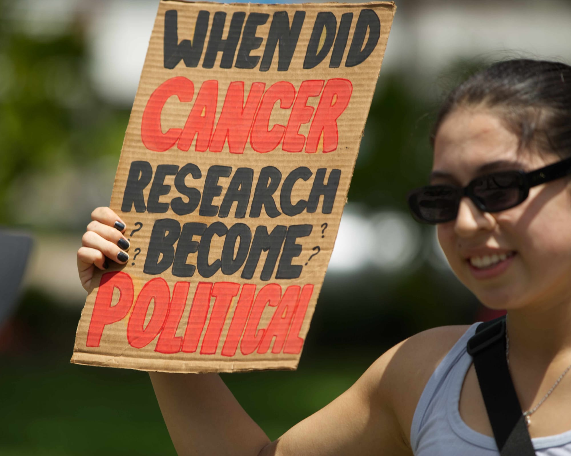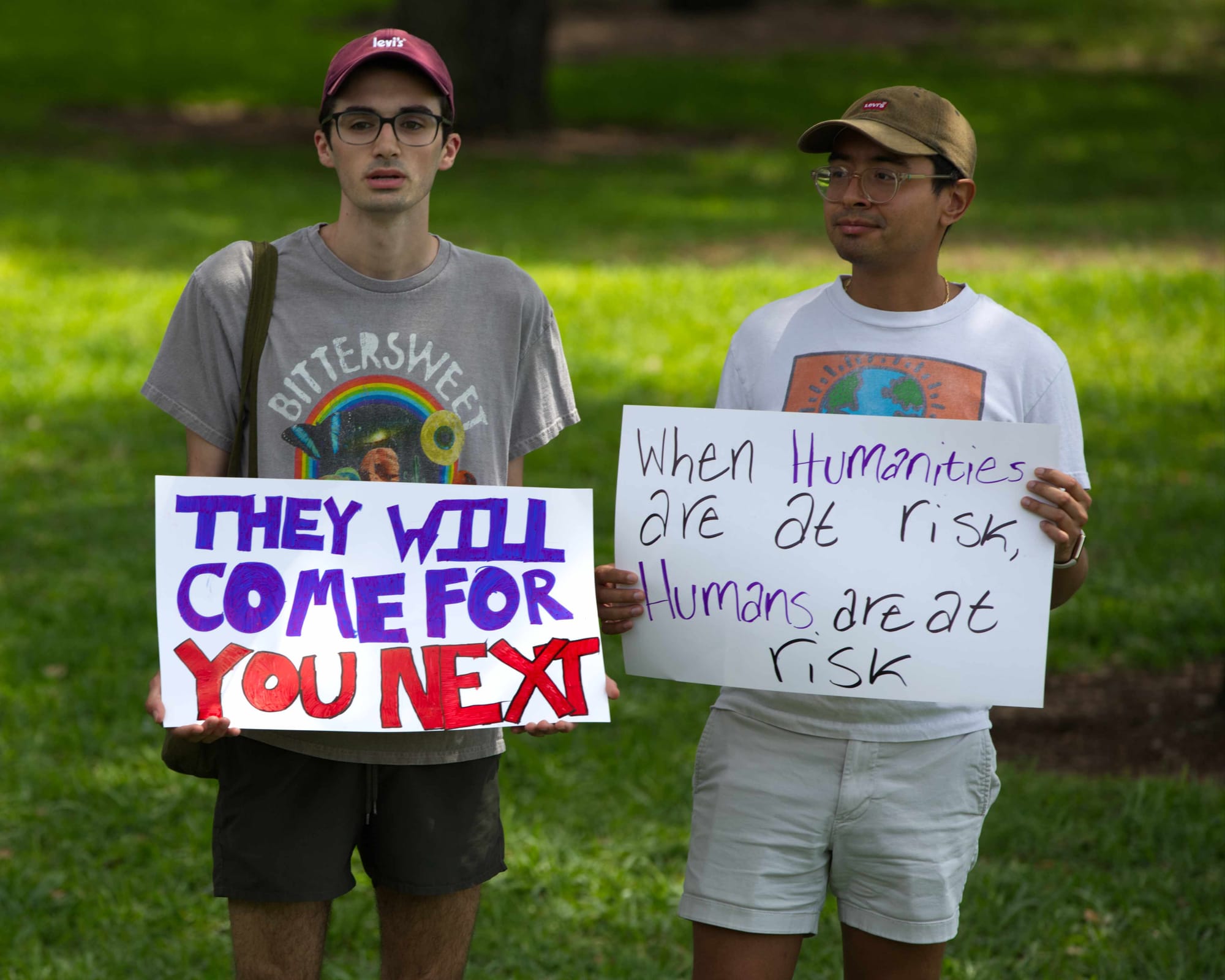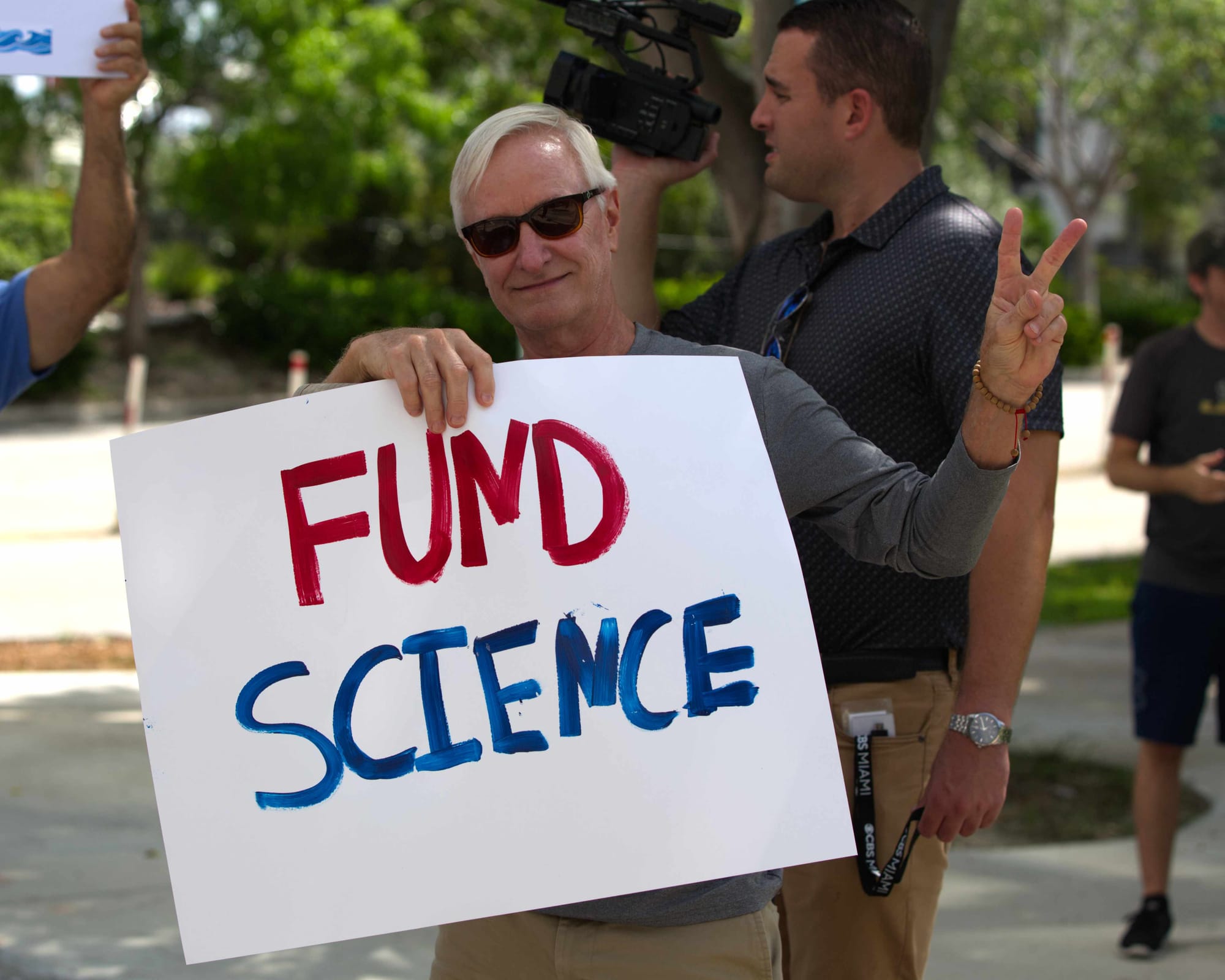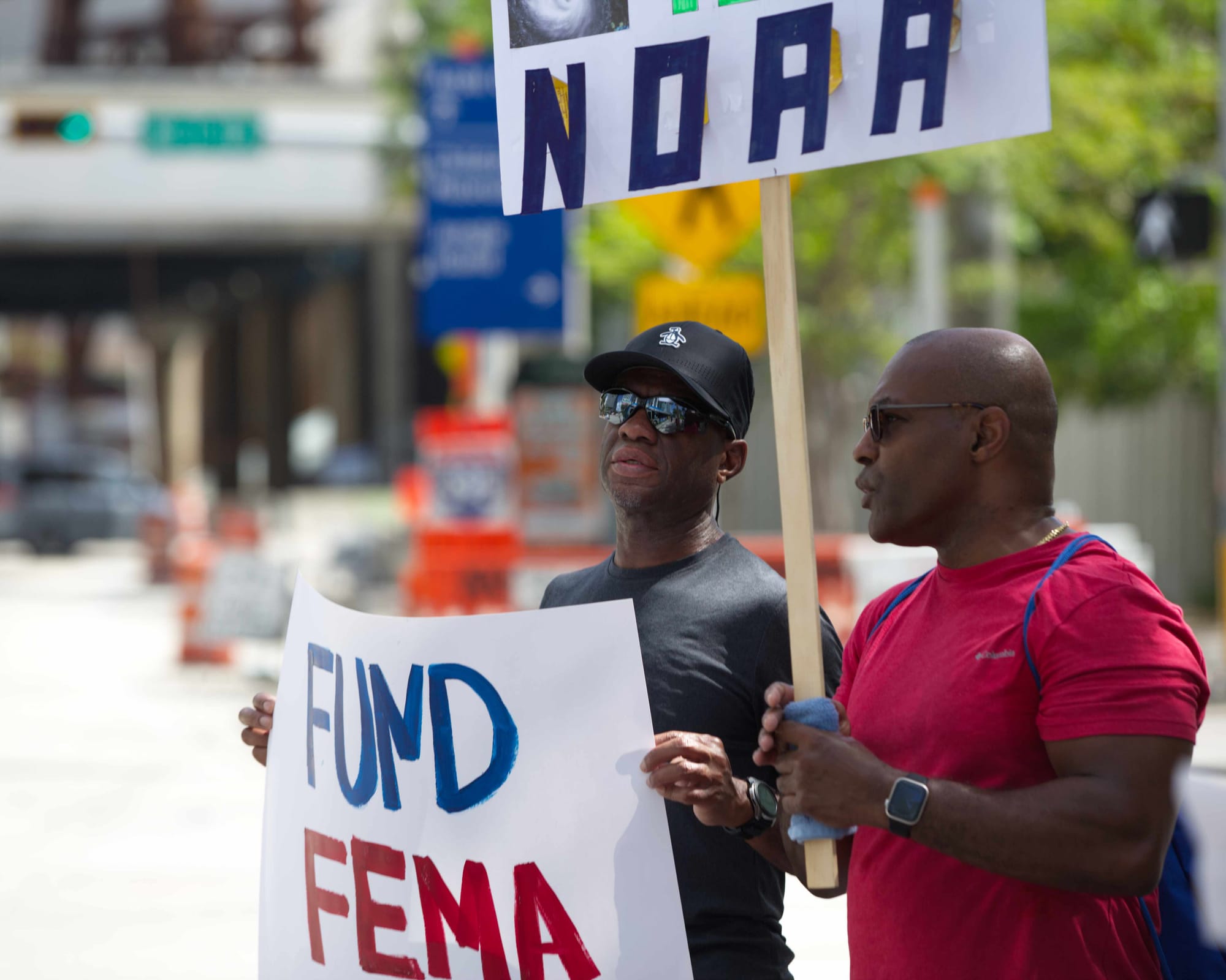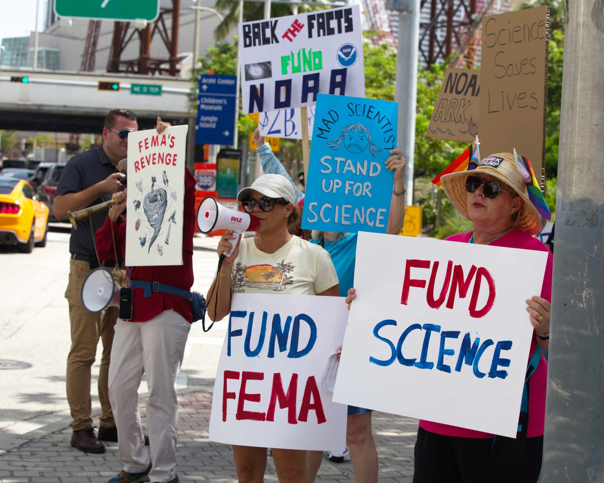 The two men with megaphones are climate scientists who were recently laid off. About 30 people joined the protest to protect climate science.