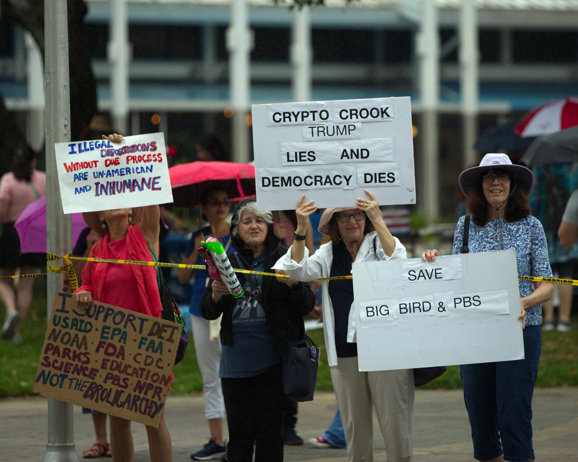 Perhaps 80 protesters on a rainy day in Miami at the Torch of Friendship, May 3, 2025.