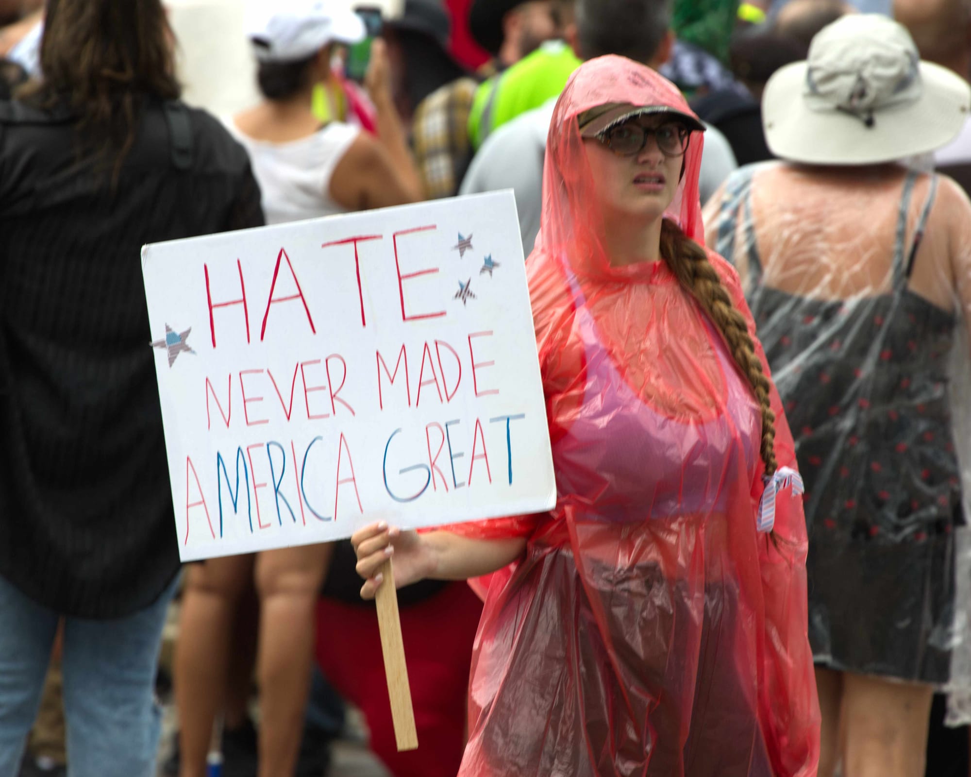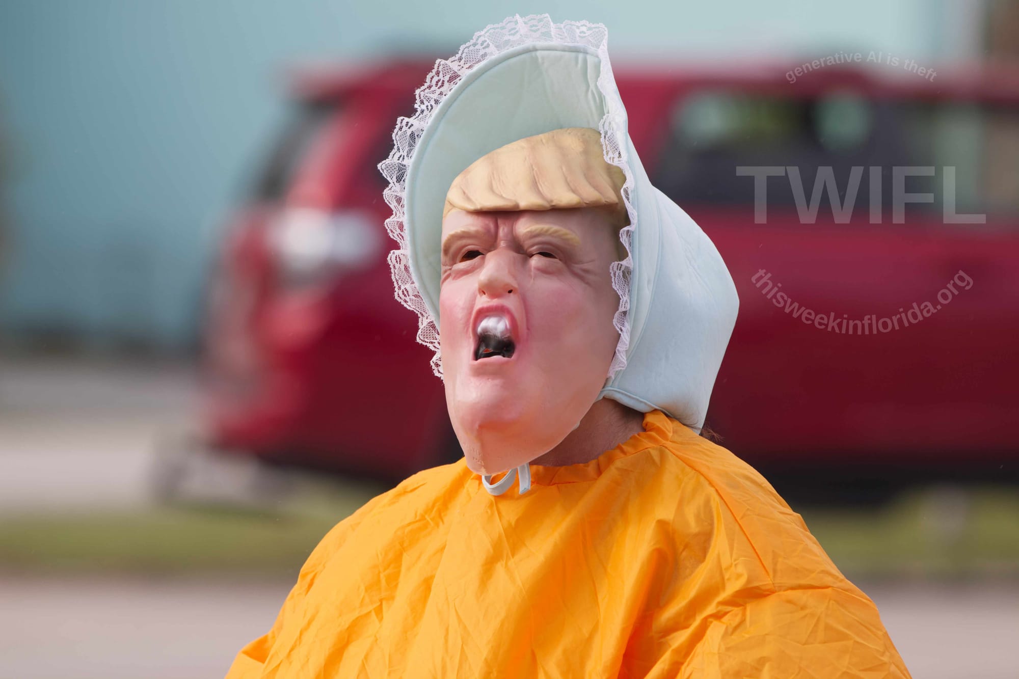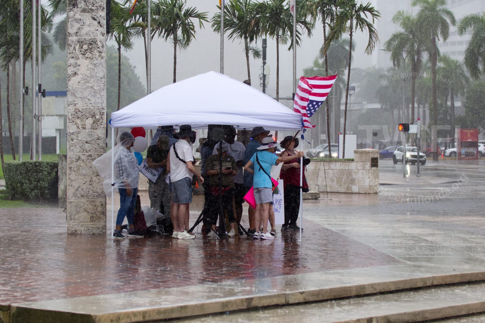 Protesters and a counter protester dressed as, apparently, a chicken boy (as opposed to a cow boy) brave the daily down pour at the Torch of Friendship in Miami on 4 July 2025. Photos Credit Philip Cardella Copyright 2025.