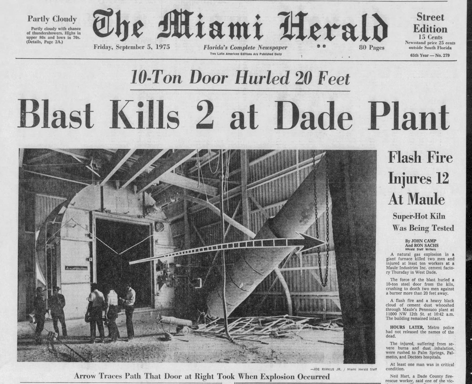 Do you remember this? Fifty years ago this week a cement kiln in Dade county exploded blowing a ten ton door over twenty feet and killing two men. Another died as well due to the blast. Here's where the story gets really interesting. The owner of the kiln was a company called Maule Industries. The owner of Maule Industries? Maurice Ferré, who you may recall as the Mayor of Miami for six terms from 1973 to 1985. He's sometimes remembered as "The Father of Modern Miami."