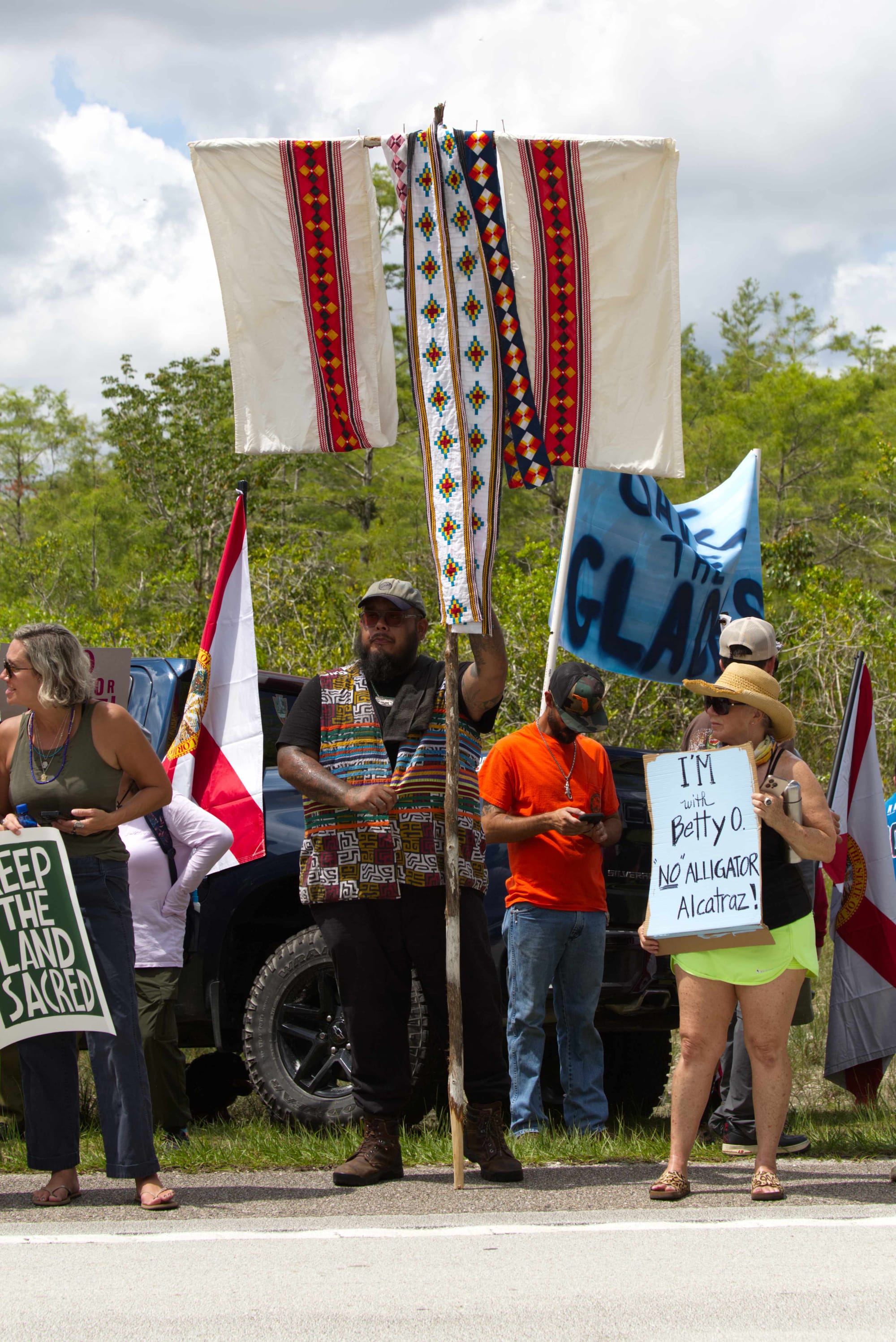 Members of the Miccosukee Tribe of Indians were present defending the sacred nature of the land. One protester said that this was not their first protest at this location. The site has been home to people for at least 2,000 years.