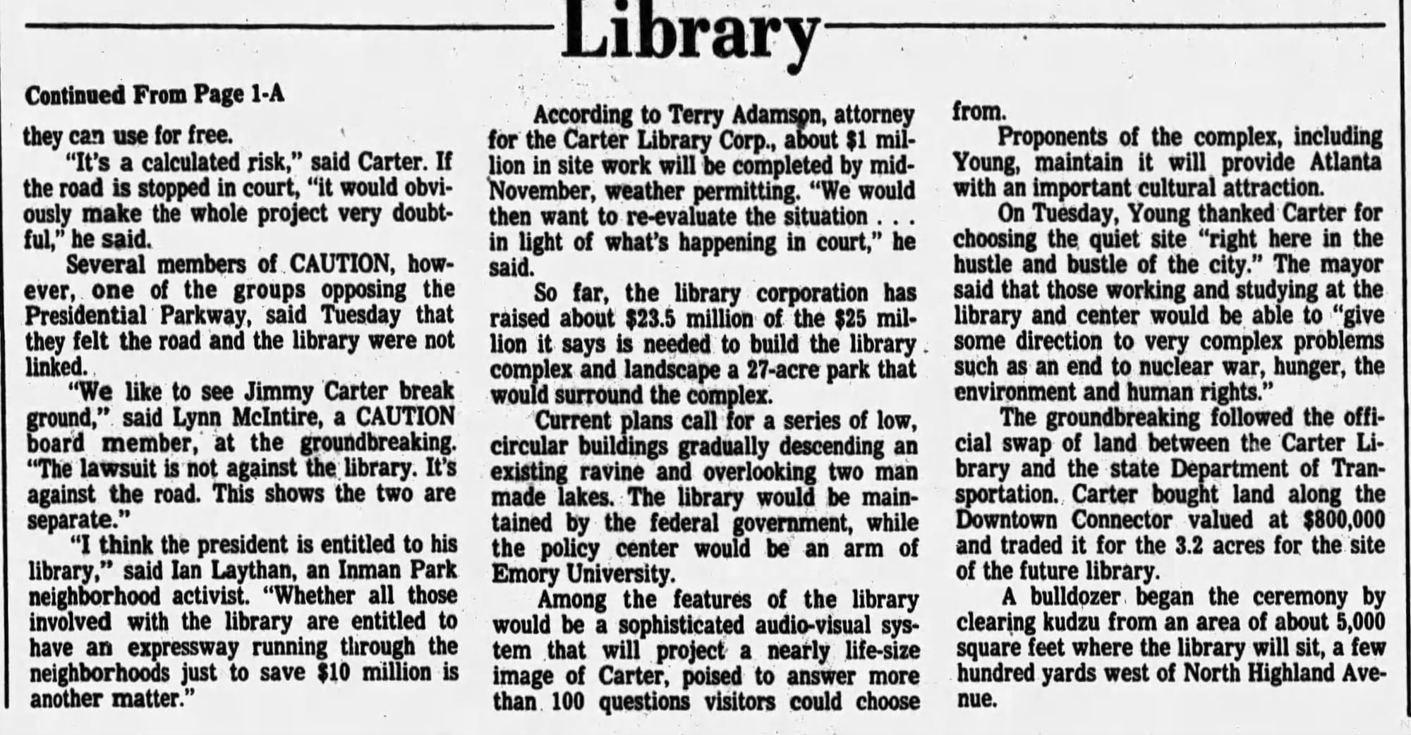 It's not straightforward how to know for certain how the land for the Carter Presidential Library was acquired on the library's website or elsewhere, but The Atlanta Constitution said in 1984 that Carter bought land valued at $800,000 ($2.5m today) and swapped it for property with the Georgia Department of Transportation. Property, it should be noted, the Georgia DOT purchased for a project that collapsed a decade earlier during Carter's term as governor and was laying unused.