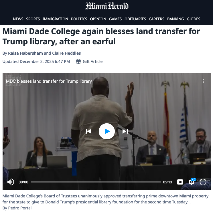 For three hours community members plead their cases for and against Miami-Dade College (formerly, Miami-Dade Community College) transferring likely the most valuable underdeveloped property it owns to the State of Florida, which would then transfer it to the Trump Presidential Library, free of charge.