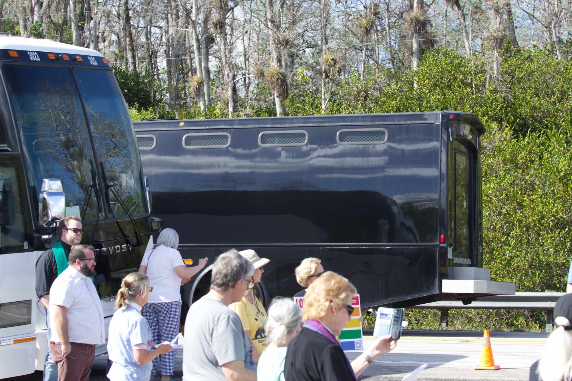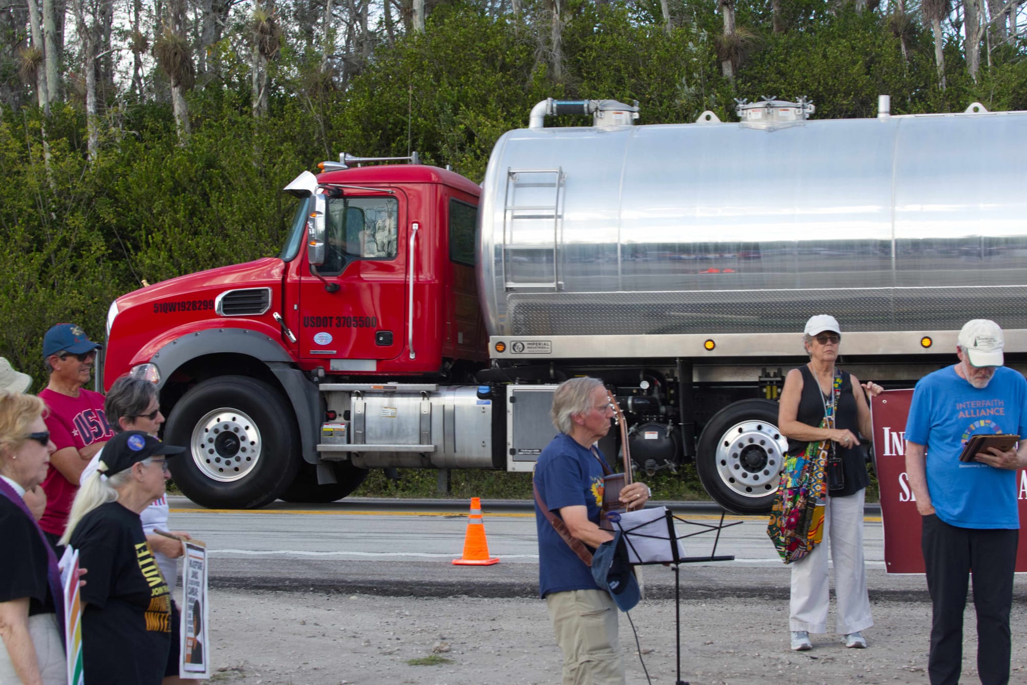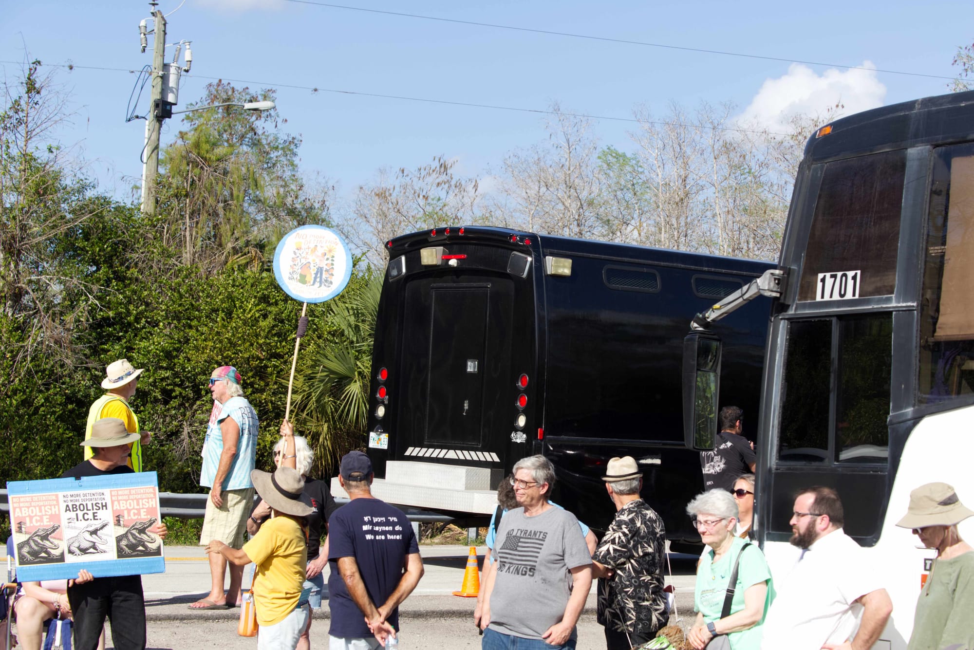An unmarked vehicle, perhaps a prisoner transfer vehicle based on the windows, rolls past the prayer vigil across from the entrance to the so-called Alligator Alcatraz on 8 March 2026. Photo Credit Philip Cardella.