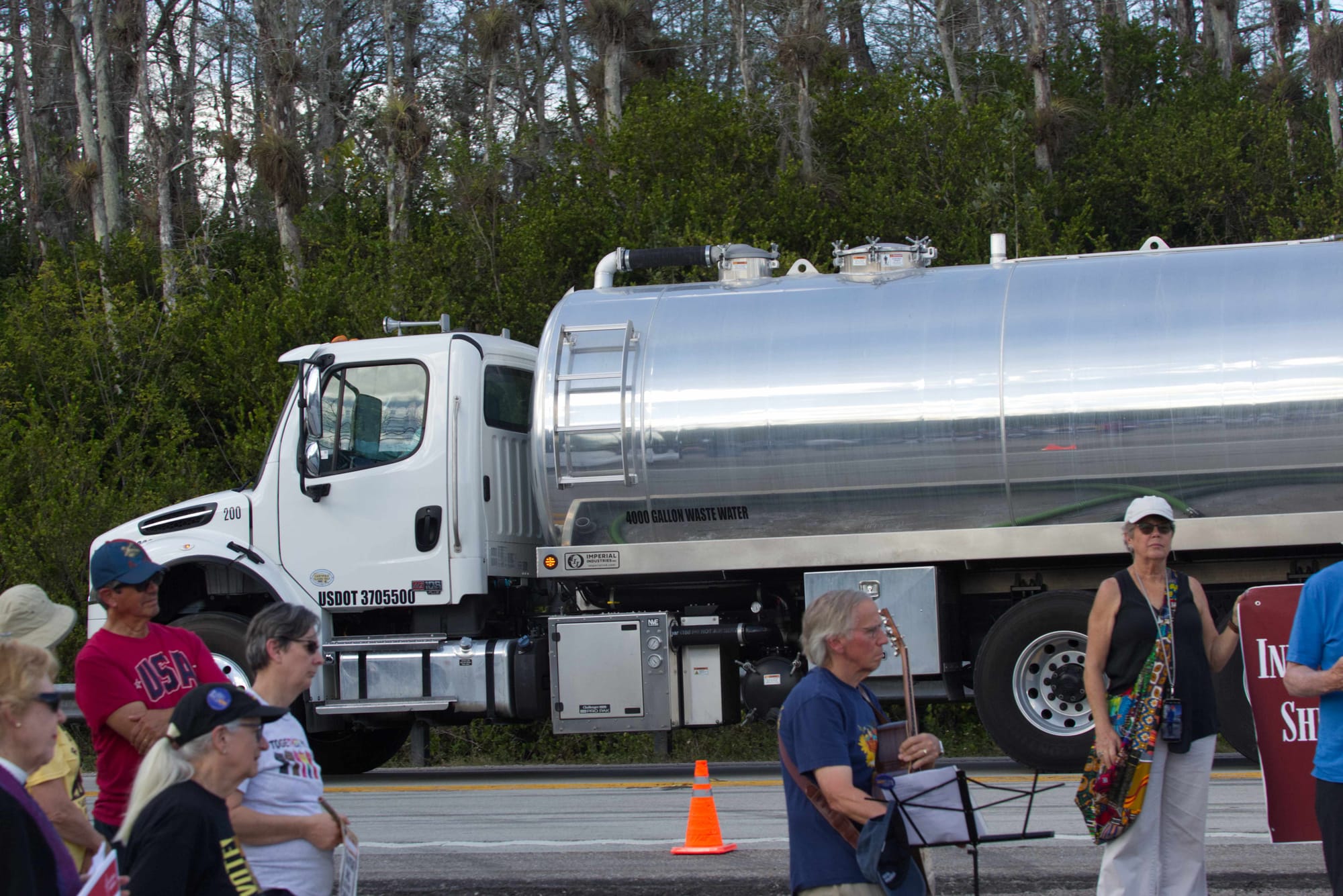Two Doodie Calls trucks (per the DOT number 370550) pulling out of the so-called Alligator Alcatraz just after 4 PM on Sunday March 8, 2026 without their company logos. A third, properly logoed Doodie Calls truck rolled past around 4:24. Photos Credit Philip Cardella 2026.