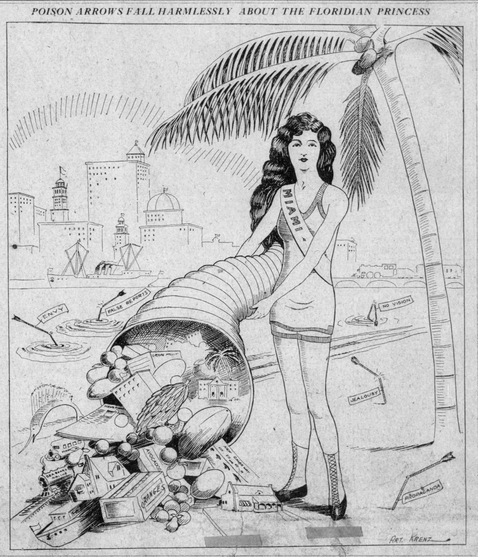100 years ago this week the Magic City of Miami felt secure in its own successes and excesses as the cartoon– the main photo above the fold on the front page of the Miami Herald on October 7, 1925– shows. While the woman depicted in the cartoon may not seem drawn in a particularly alluring way, one is reminded that this was decades (specifically 21 years) before the outright scandal of the bikini would shock the world before quickly becoming a Florida beach mainstay.