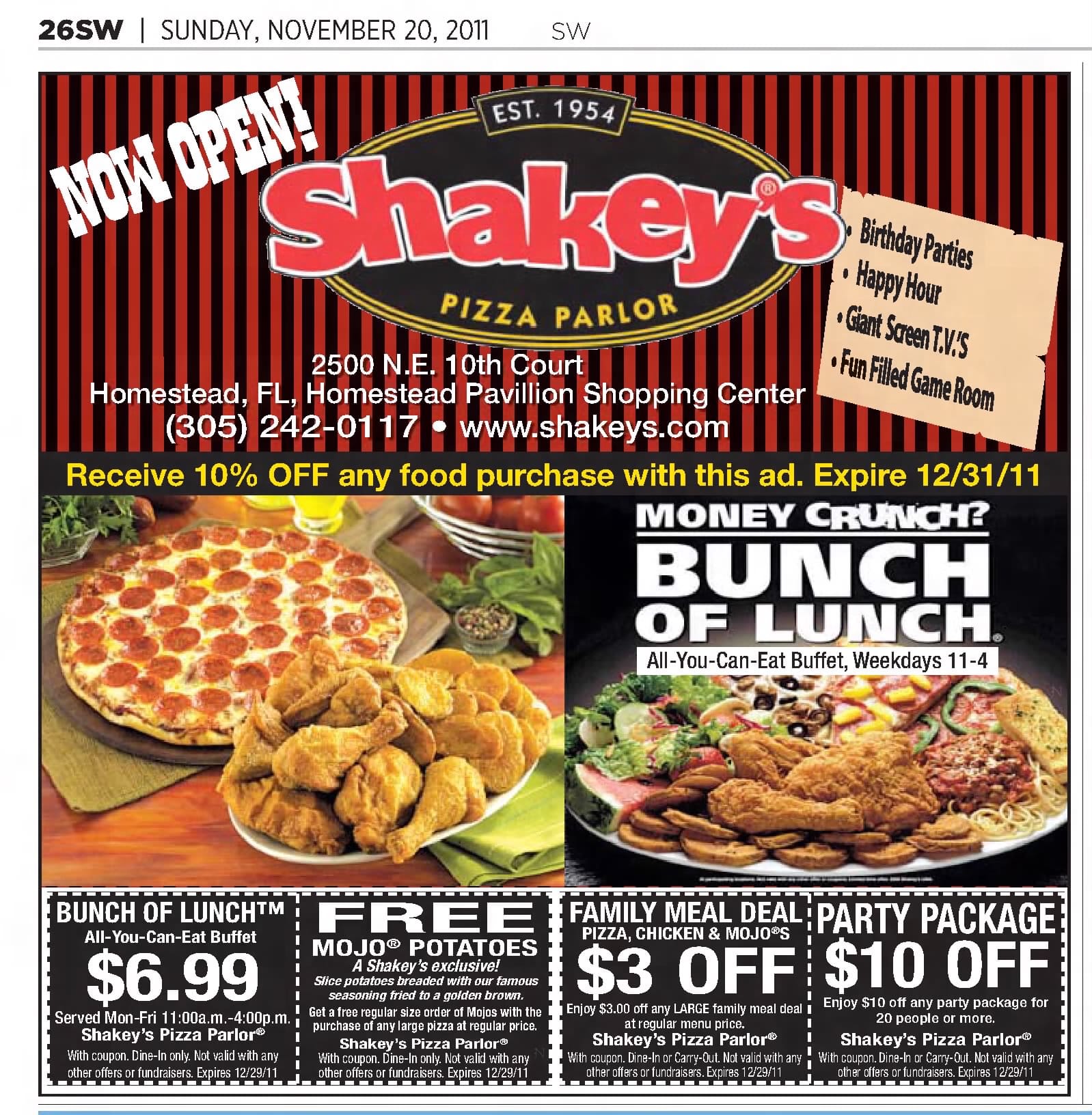 A commercial photo shoot photo from the Shakey's Pizza Parlor in Tampa, Florida from the early 1970s. From Gandy Collection of Aerial and Commercial Photography, Box 37, from the University of South Florida special collections. An ad from the Miami Herald on November 20, 2011, for Shakey's Pizza Parlor "Now Open". The Shakey's in Homestead closed sometime after January 2013.