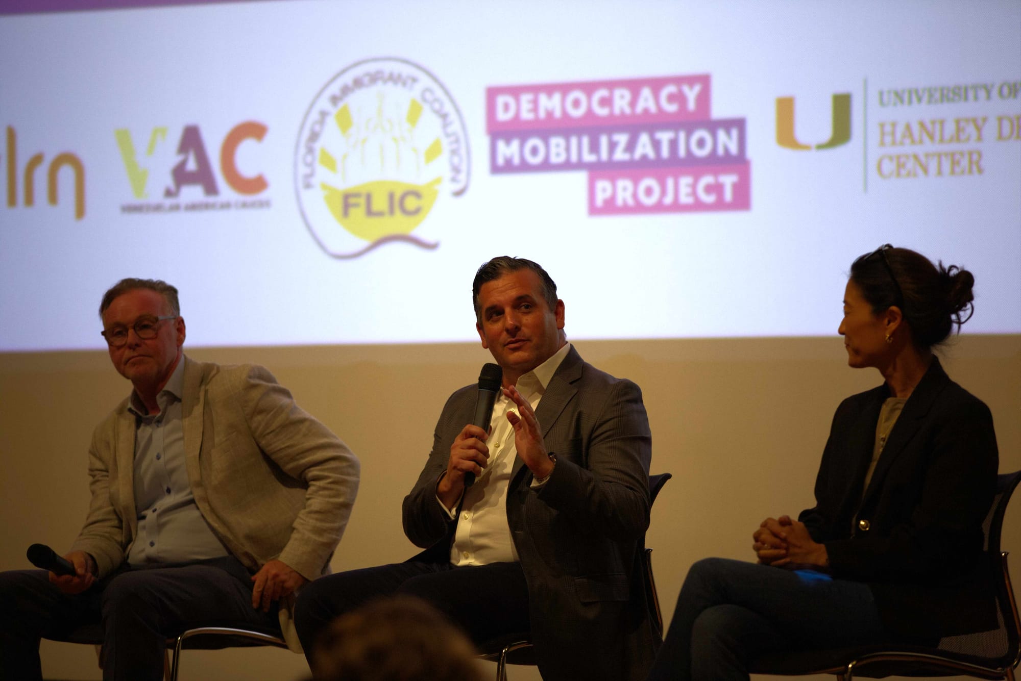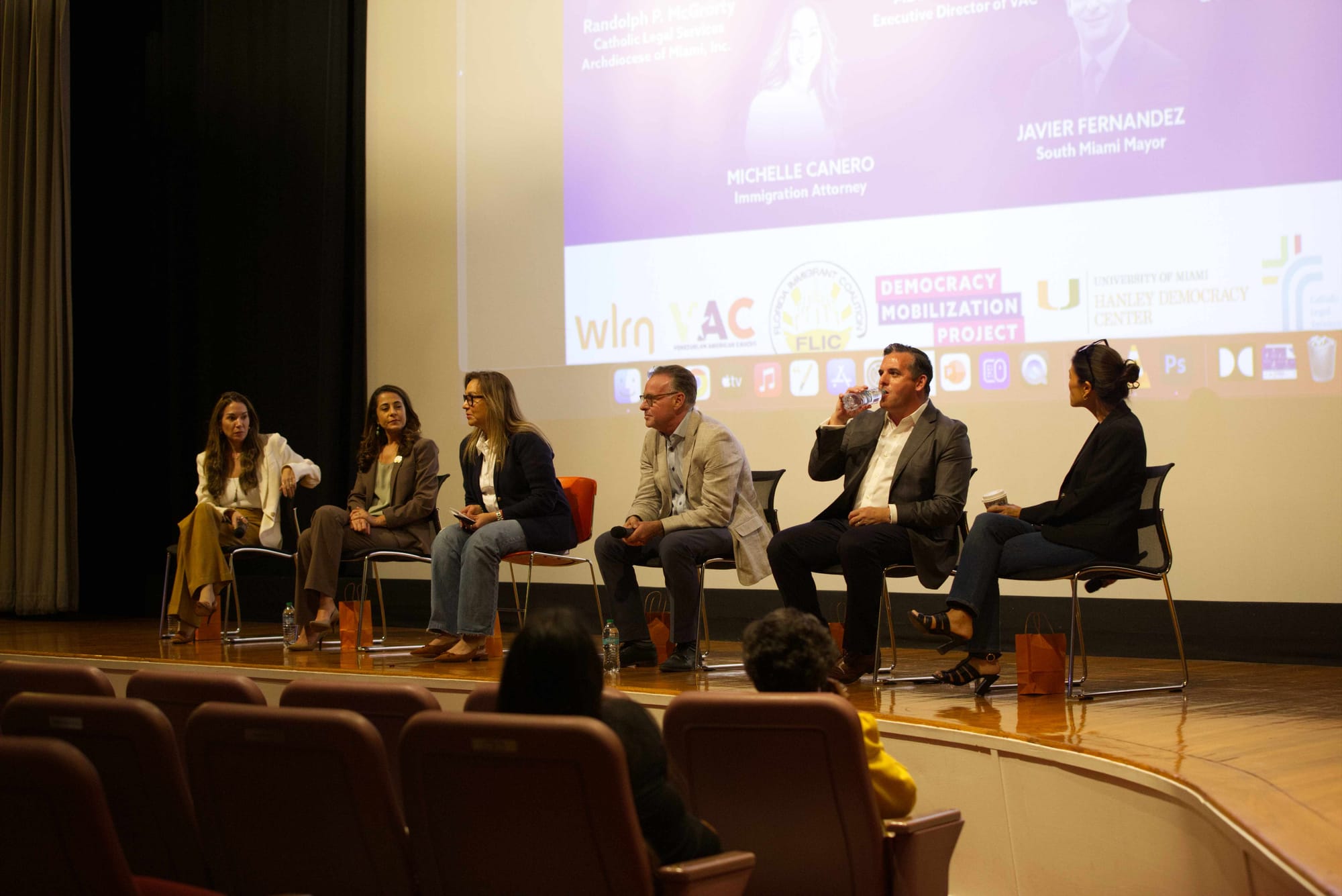 The event, organized by former US House Member from Florida's 26th Congressional District, Debbie Murcarsel-Powell, herself an immigrant and the first South American born person elected to Congresss, was hosted by the University of Miami's Hanley Democracy Center and the Democracy Mobilization Project and drew over 100 community member's to the Coral Gables campus.