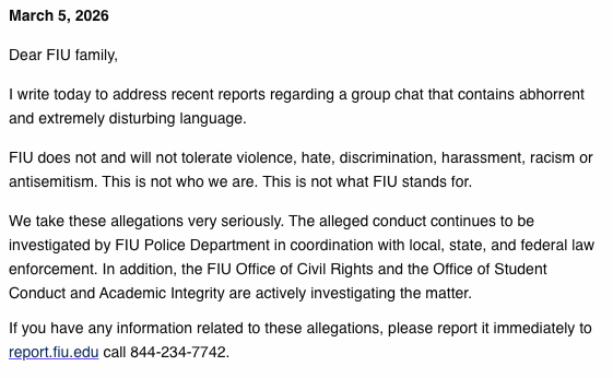 Meanwhile, Florida International University's President, Jeanette M. Nunez, the former Lieutenant Governor under Ron DeSantis, sent this email to the FIU community on 5 March 2026 condemning the chat and promising investigate it.