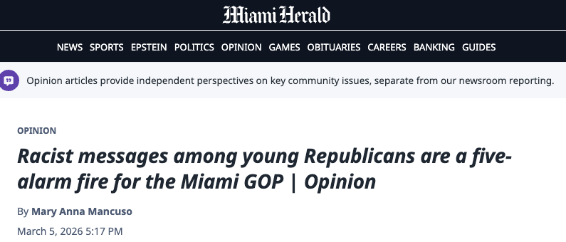 The Floridian's story about the vile group chat connected to the campus GOP and Turning Points USA chapter members, appeared on 4 March 2026, the same day that the Florida State Senate passed legislation that will name the road Florida International University, site of the vile chat that the President of Charlie Kirk's Turning Point USA participated in, "Charlie Kirk Memorial Avenue."