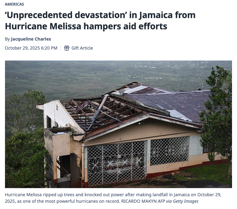 Its been more than a day so I know a lot of our minds have moved on from the record breaking hurricane that smashed into the island nation of Jamaica last week, but it is worth reminding everyone, I think, about both its devastation and our response to it.