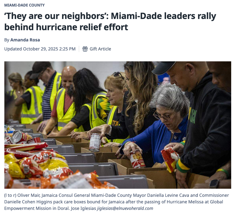 And you see it in stories, like one below, about Miami-Dade County Commissioners and the Miami-Dade County Mayor packing supplies for victims of Hurricane Melissa.