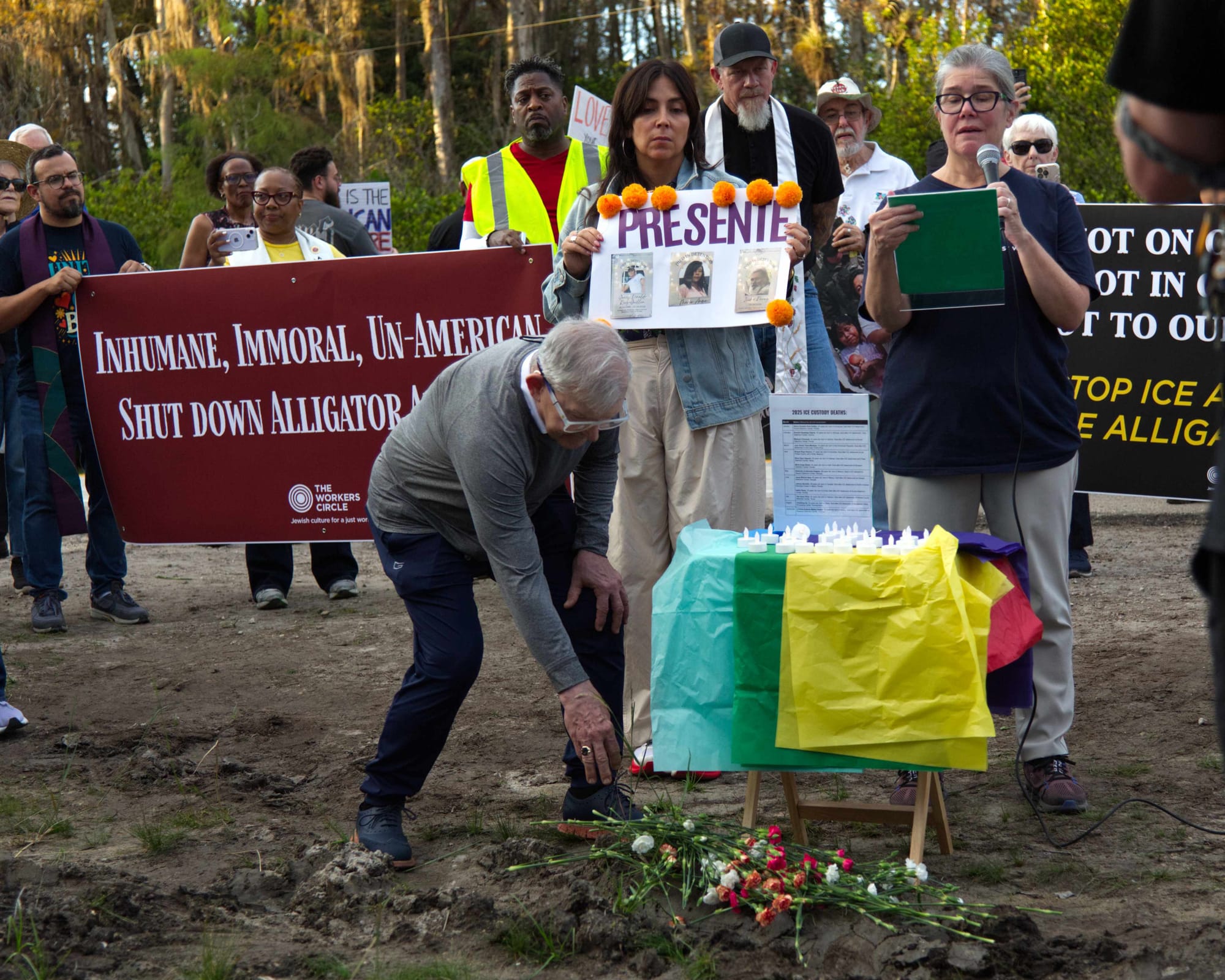 To illustrate the point, it was noted that a few weeks ago an employee of Alligator Alcatraz joined the vigil, offering prayers for those detained. He is putting food on the table but hates his job.