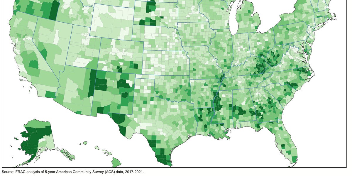 That's right. Miami-Dade County is one of the darker shades of green on the map, indicating that as of 2021 the county I live in has nearly one in four households receiving SNAP. If you know your geography, you'll note that Los Angeles County, King County (Seattle), Sacramento, San Francisco and the surrounding counties, New York, Chicago, Houston, Dallas and San Antonio are not shaded in that darker green. Most of them are in fact the lighter or even the lightest color.