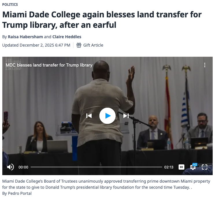 Why this goes into the Finite Disappointment section has nothing to do with my views of the potential library or even the proposed land deal (where the community college, which is technically a state entity, transfers property valued between $60-$300 million to the state and the state gives it to the Trump Presidential Library Foundation for free). Rather, it's about the meeting the President of Miami-Dade (nee Community) College and its male trustees (it is dominated by male trustees and it was glaring that the women on the Board were not physically present, though they did call in) held on Tuesday in the suburb of Hialeah at 8 AM.