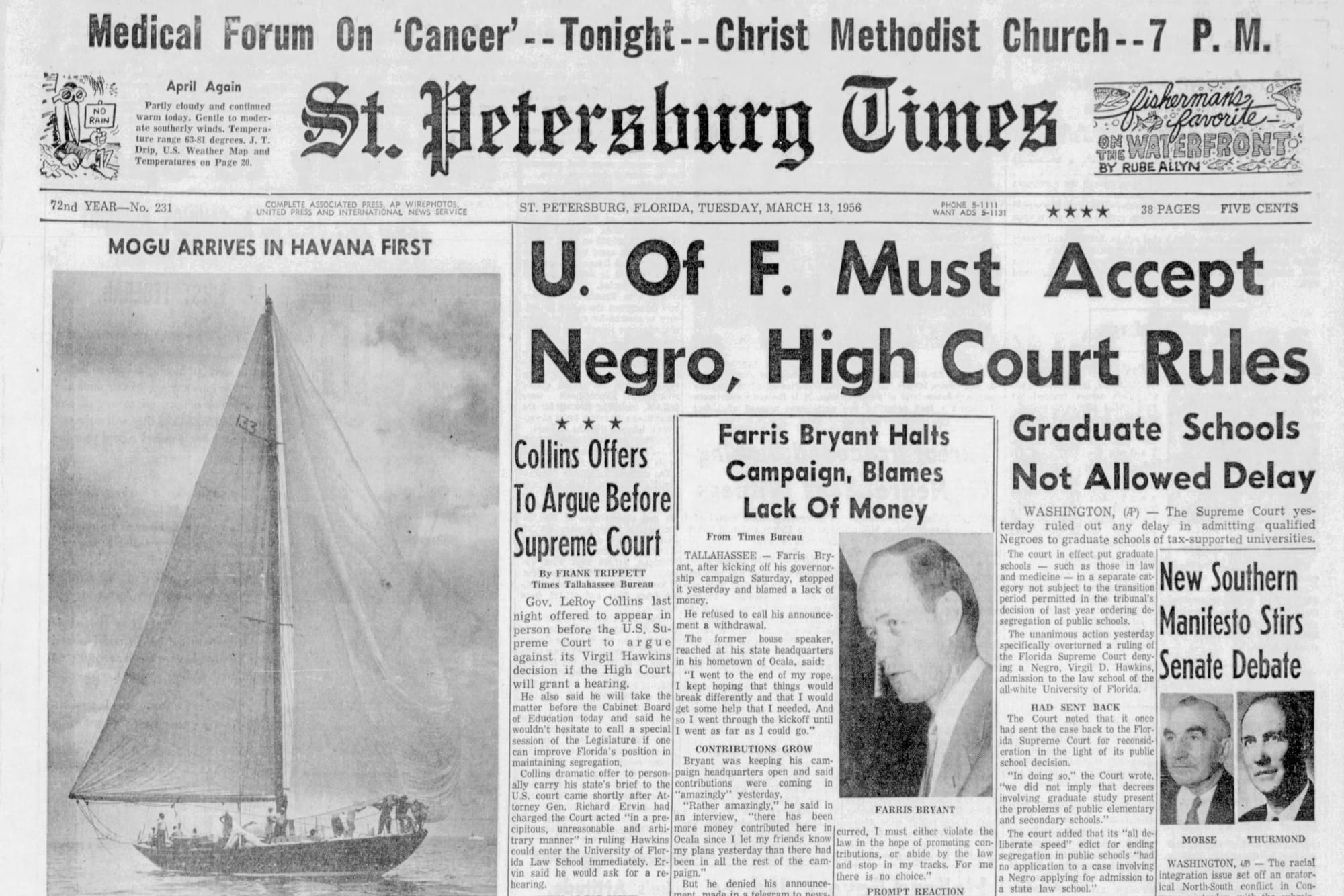 March 13, 1956 As I've said, it's been a busy week so I'm not going to do justice to the anniversary of the Supreme Court ruling in favor of Virgil Hawkins, a black man who spent years trying to be admitted into the University of Florida School of Law, and decades after that trying to open his own law office.
