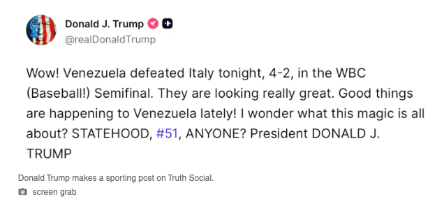 Venezuela defeated Italy in the World Baseball Classic in Miami on Monday and that prompted the President of the United States to float the idea of statehood for a country living under a dictatorship with a per capita annual income of $4510.62. Of course, long time US territory with a much stronger economy, Puerto Rico, is not going to be considered for statehood, for reasons.