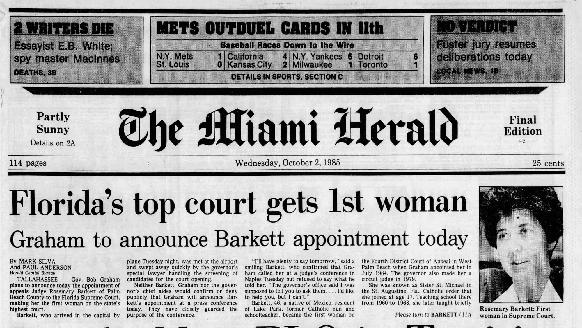 October 2, 1985 Tallahassee Florida Governor Bob Graham announced his intention to appoint a woman to Florida's Supreme Court. That woman was Rosemary Barkett and she'd be Florida's first woman to sit on the Supreme Court and first woman to become Chief Justice of the Supreme Court. Serving on Florida's Supreme Court would be just one step of many to an illustrious career that included a two year term as the Chief Justice of the Supreme Court of Florida, and nearly 20 years sitting on the US Eleventh Circuit Court of Appeals. A 2021 University of Miami School of Law event listed her as an active member of "The Hague-based Iran-United States Claims Tribunal."