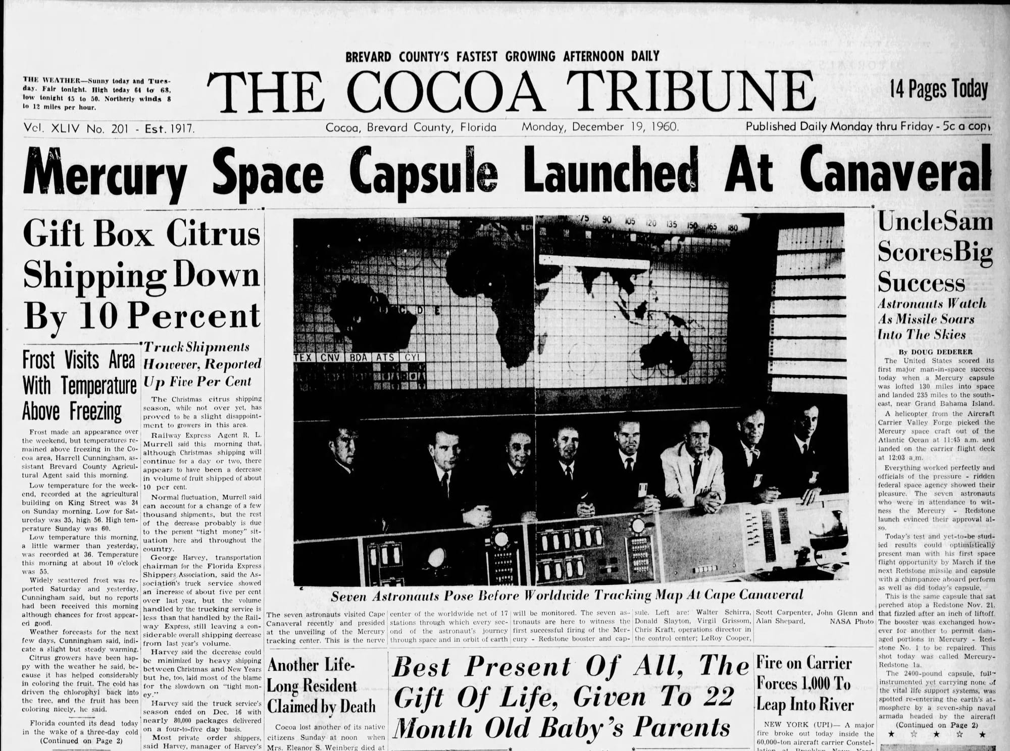 Just under six months later Alan Shepard, one of the Mercury 7 in the photo in the newspaper, would brave the first American flight into space on May 5, 1961 from the same launch site. In February of 1962 John Glenn would be the first American to orbit the Earth, once again launching from Cape Canaveral, Florida.