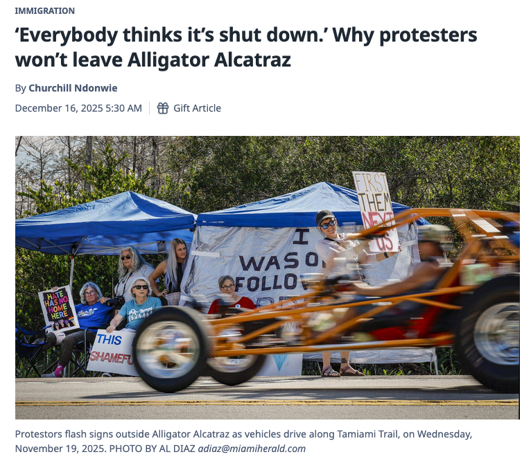 Both of these films feature Betty Osceola, the Miccosukee Tribe of Indians of Florida member who has been helping welcome folks to the weekly Sunday prayer vigils since Alligator Alcatraz opened on the edge of Everglades National Park, on Miccosukee land inside Big Cypress National Preserve.