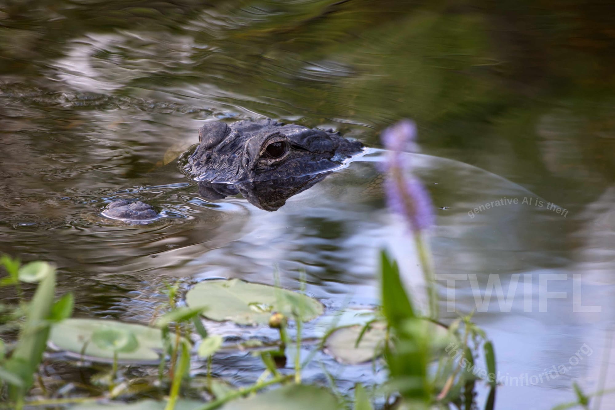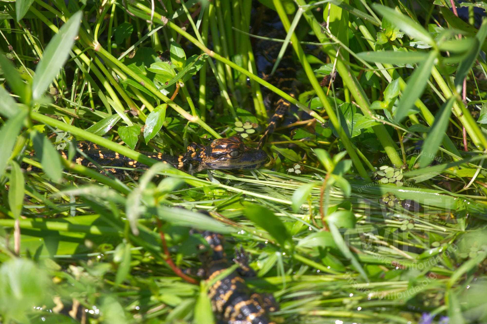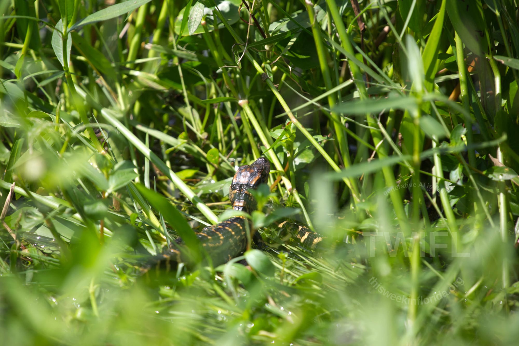Two photos of momma gator's babies, one photo of momma gator watching her baby from the water and a picture of an escaped alligator egg. These photos were taken on September 16, 2025 at Shark Valley, about 150 yards from the Visitor Center Parking Lot. Photo Credits Philip Cardella TWIFL Copyright 2025.