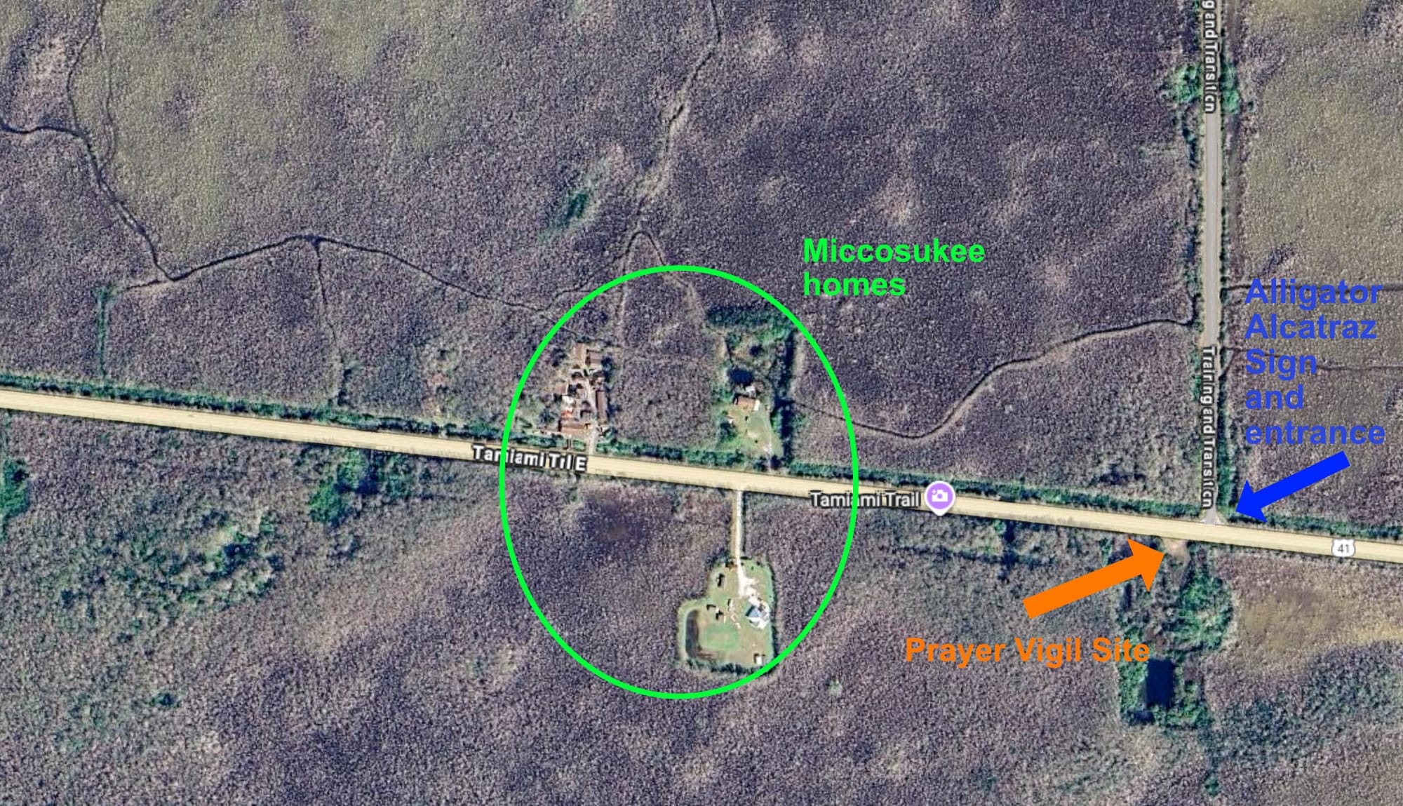 And then there's this. This is a close up of the image above with the road gate to A***** A***** the fork in the road on the right. The stuff in the middle? Those are houses owned by members of the Miccosukee Tribe of Indians and that spot is a bus stop for school busses.
